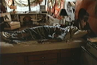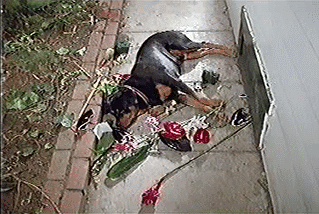 Anyways, while tying his shoe and trying to make sense of his life Mr. Rooney realizes that the entire time there has been a dog door behind him that would allow him easy access into the house. Rooney tries to enter through the dog door but is greeted with a Rottweiler of all dogs in the kitchen who starts growling at him. Rooney for the first time in the movie does the sensible thing and runs for his life before the comedic writing gets the chance to fulfill it's destiny.