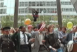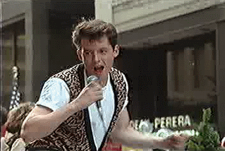 So this is the moment all of my "that's for later" comments have been referring to. The most out of place scene in the entire film, possibly one of the most out of place scenes in cinema history. Cameron and Sloane are walking around looking for Ferris who has seemed to have just disappeared into thin air. If that had actually happened this movie would have gotten a whole lot more interesting, however we aren't so lucky. And so while they are looking for him, Ferris reveals himself... on top of the parade float. Now let me just clarify this. Ferris spent what had to have been weeks preparing his grand escape from your parents and school, spending what was probably a lot of money too having to save up enough for food, the wardrobe, admission tickets to the baseball game (Unless he just snuck in), the equipment needed for the doorbell machine and possibly gas for the car. And after all that effort you give it all away by showing your true self to half the city. It also sucks for Rooney because had this movie had any sense of reality Rooney's quest would have been in vein after the entire city found out all at once. This is seriously the worst decision I have ever seen be made by a main protagonist of any form of entertainment media.