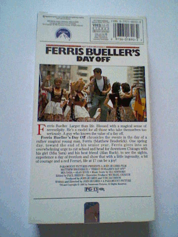 One more thing before we start the movie, the tape starts out with an advertisement for other movies by Paramount. This is normal, as even before DVDs home media publishers still wanted to make even more money off their tapes than what they already were. But what I find odd is that this advertisement actually has an advertisement for Ferris Bueller's Day Off, the movie I'm literally about to watch. I guess they didn't want to edit the commercial for every tape they put it on which makes sense, but what's inexcusable is that the clip they show of the movie is arguably the climax of the A Plot, where the Ferrari flies out the window. What's even worse is that the back of the box reads: (And I quote) "...experience a day of freedom and show that with a little ingenuity, a bit of courage and a red Ferrari, life at 17 can be a joy!" meaning that anyone who happened to have not seen the movie before and read the back of the box would have the movie spoiled for them LITERALLY before the movie even begins, by the studio themselves! Now THAT'S how you kick off a movie to a terrible start.Also my copy of the tape doesn't even have an endlabel. Why? Did they run out of paper? I got the tape brand-new & sealed in the box, so it isn't like it was removed at any point.