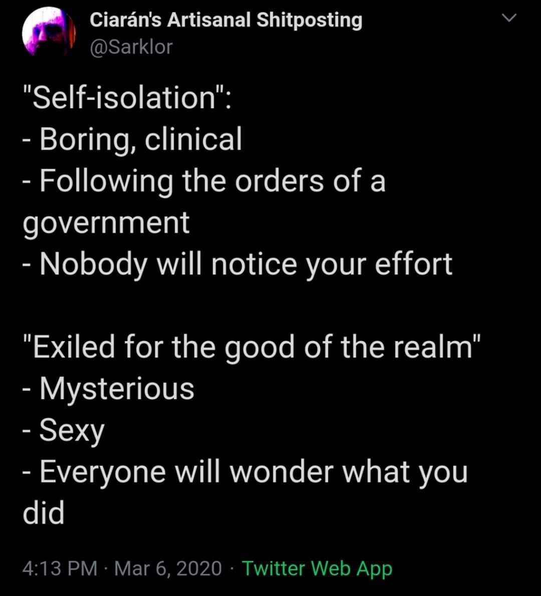 Well, there you are. I just wanted to write this as a record for what my life is like at this time. I don't plan on making a regular blog or journal of this, as not much happens during isolation. Though I am backing up my IRC logs, those should be really interesting to read twenty years down the road.