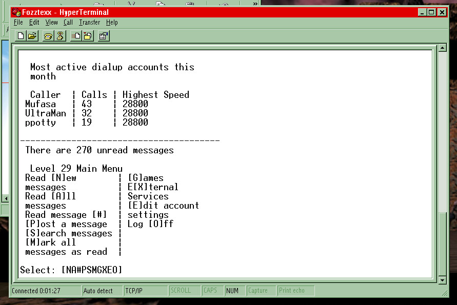 There are also things I can do with Windows 98 that I can do with many other machines, including the XP machine I have sitting at the same desk (See THIS picture), but it's just neat to see it running in 98, whether because it's more authentic or just a novel experience to run it on something so old. Take for example, HyperTerminal. HyperTerminal is included with Windows XP, but why would you want to use it with XP when you have it installed on 98? I wanted to use it to watch ASCII Star Wars, but it seems that towel.blinkenlights.dl is down and has been for some time at the moment I'm typing this. So instead, I used it to connect to a BBS. I can't say "dial up a BBS" because I'm using TCP/IP over a LAN, but it's better than nothing. Here you can see HyperTerminal connected to bbs.fozztexx.com, and yeah, it works.