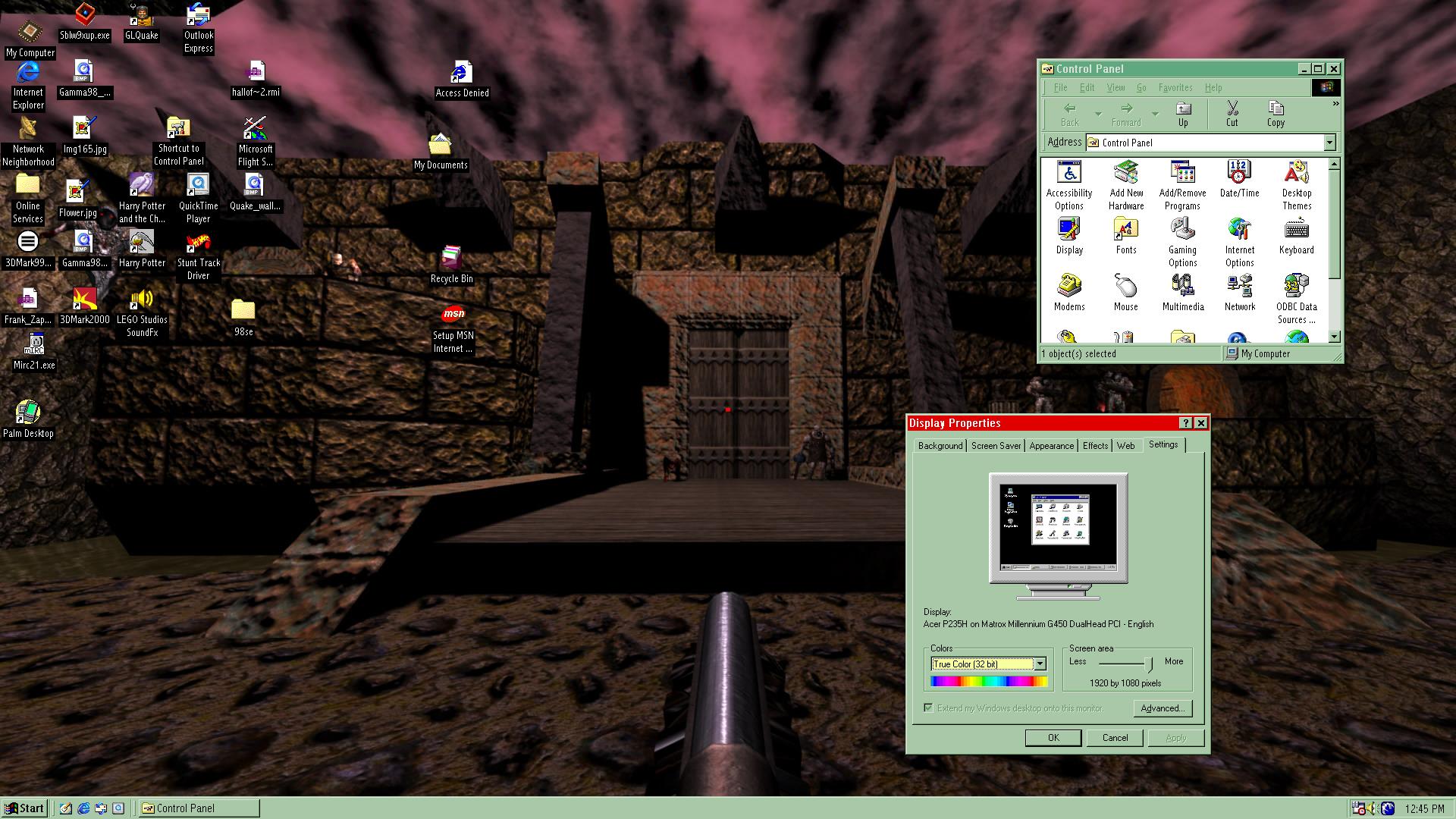 Though the authenticity of this setup is a bit questionable, because during the brief time I was trying to get 98 running on Mr. eMachines I thought I could crudely fix the standard VGA problem by ordering a PCI video card. So I went to eBay and bought a Matrox G450 for $35.00, free shipping. Once I realized the GX270 in the basement had official drivers that would allow it to run 98 natively I abandoned Mr. eMachines, but now had a video card in transit. Figuring I might as well use it, I put it in the GX270. Here's the thing about the Matrox G450: even though it was billed as a gaming card it kind of sucks as a 3D accelerator, even for games of the era. But as a 2D accelerator it's absolutely perfect, if not a bit excessive. What do I mean? Well, get this. The G450, released in 1999 has two video outputs, a VGA and a DVI, Matrox refers to this as Dual-Head. The VGA head has a max resolution of, are you ready? 2048x1536 @ 60Hz. I have no idea what monitor in 1999 could handle this resolution, as even in 2021 I don't have a monitor that can handle that. But I do have an Acer P235H from 2009 that can do 1920x1080 @ 60Hz, so... yeah. Full HD Windows 98 on actual hardware.
