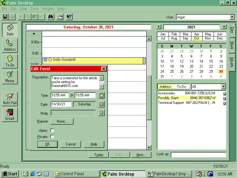 It comes in the box with all of the documentation and accessories, including the driver CD and a serial cable. The driver CD contains an organizing program for Windows aptly titled Palm Desktop, which you can use to create appointments, contacts, memos and what-not on a full sized computer and then sync it to the PDA so you don't have to fill out massive amounts of data on the tiny touch screen. You just create your data on the program, connect the PDA to your computer with the serial cable, press the HotSync™ button on the cable and boom! Everything syncs automatically! Except you have to start the sync program yourself separately from the organizing software, but, whatever.