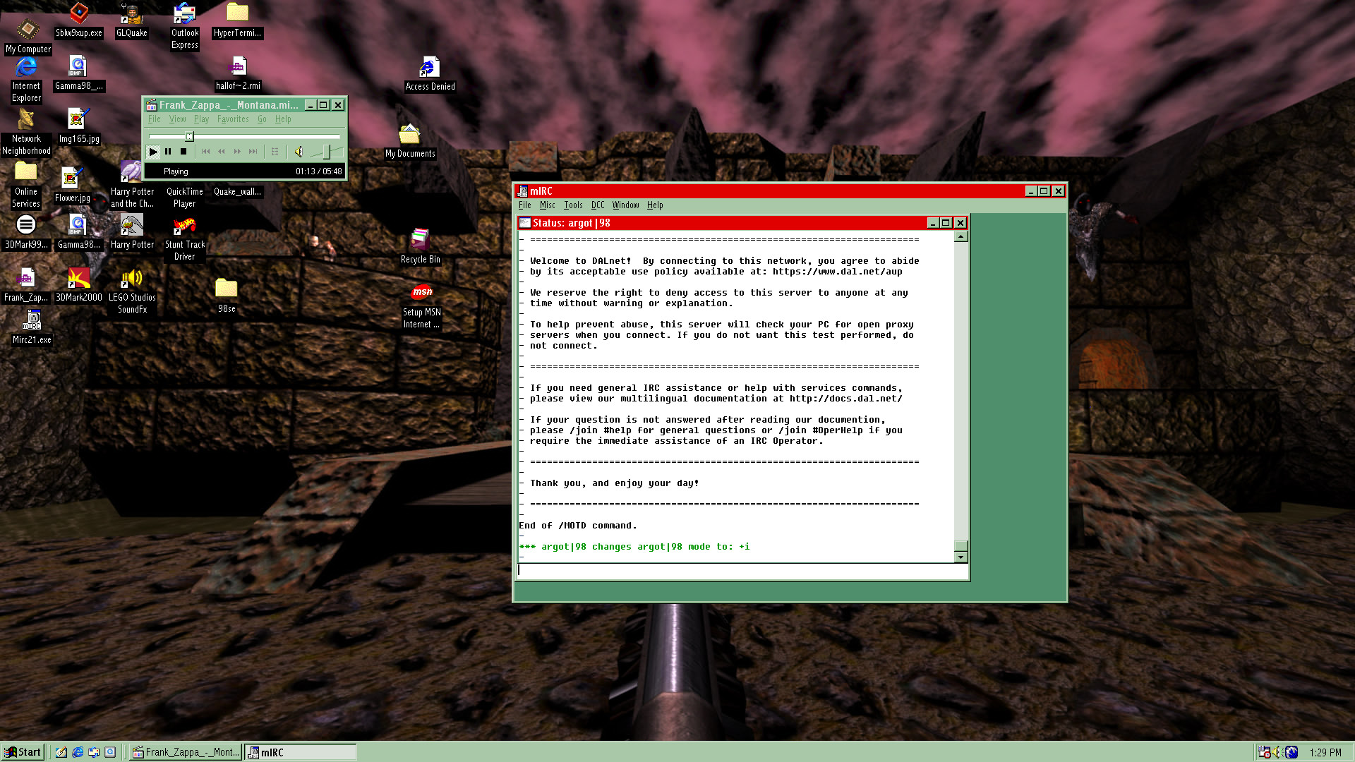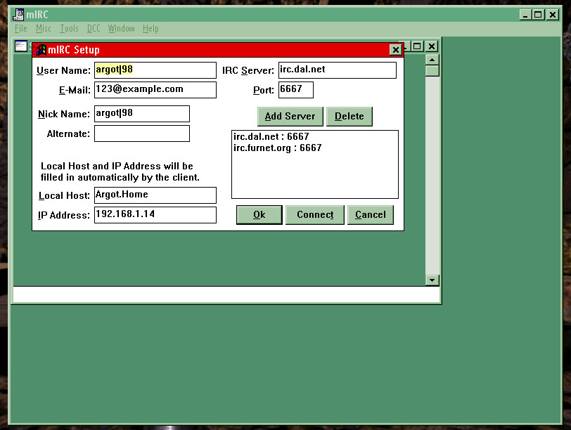Other than that, what are some other things I've done with the 98 machine? Well, I installed mIRC 2.1 and tried to connect to FurNet, however it stalled upon the server issuing a CTCP VERSION request. I guess FurNet doesn't take too kindly to IRC clients that probably have a gazillion security exploits, but not was all lost as I was recommended to try connecting to DALnet. It worked, so check that off the list. I will note about version 2.1, it doesn't have a whole lot of features... at all. Pretty much the only features it had was the abiliy to connect to one server at a time, list the channels on that network, send and recieve private messages, and save a list of favorite networks. It even uses the Windows 3.1 GUI for the settings, which is strange as I didn't think this runs on 3.1. It begs the question: What was version 1.0 like?